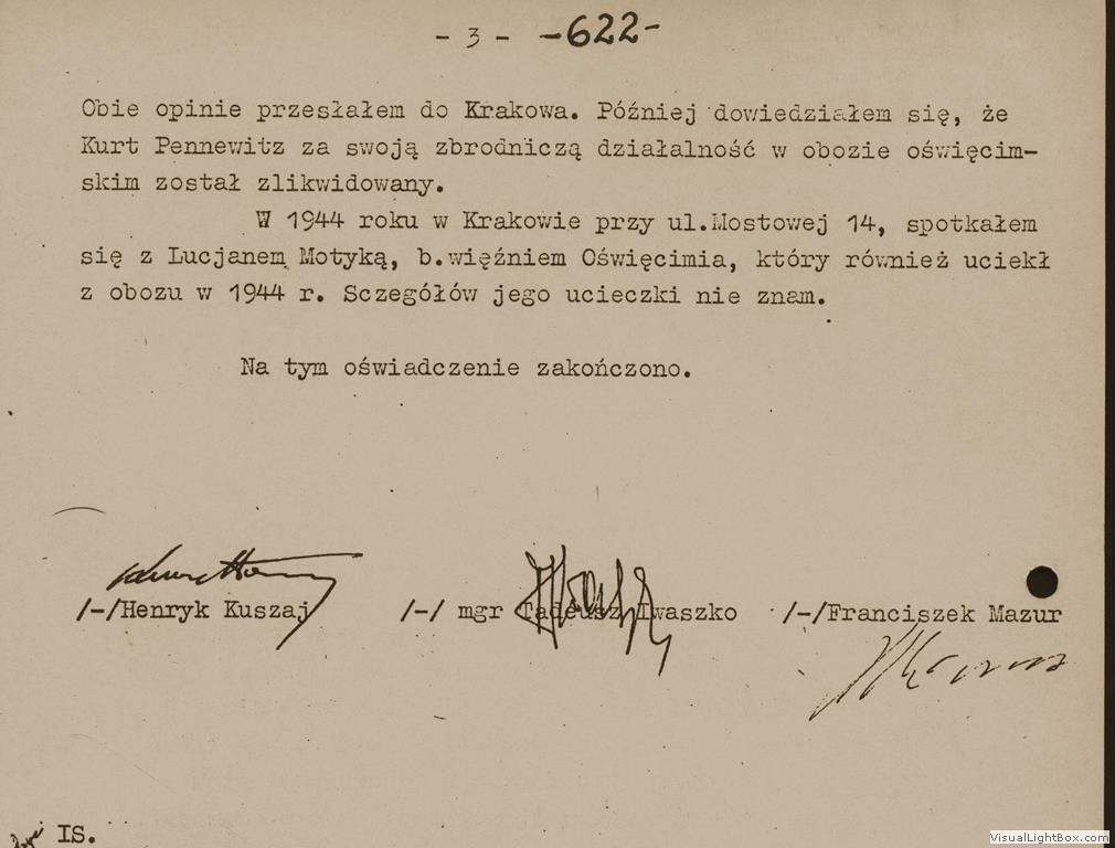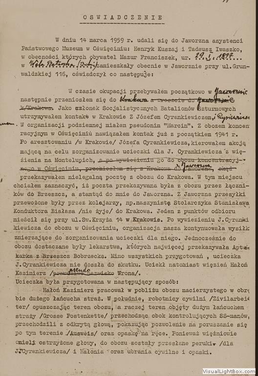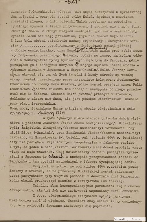Oświadczenie Franciszka Mazura, który udzielał pomocy więźniom KL Auschwitz i Neu Dachs, [w:] Oświadczenia, t. 5, k. 620-622.