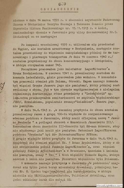 Oświadczenie Wiktora Pasikowskiego, byłego więźnia podobozu Neu Dachs, [w:] Oświadczenia, t. 5, k. 609-619.
