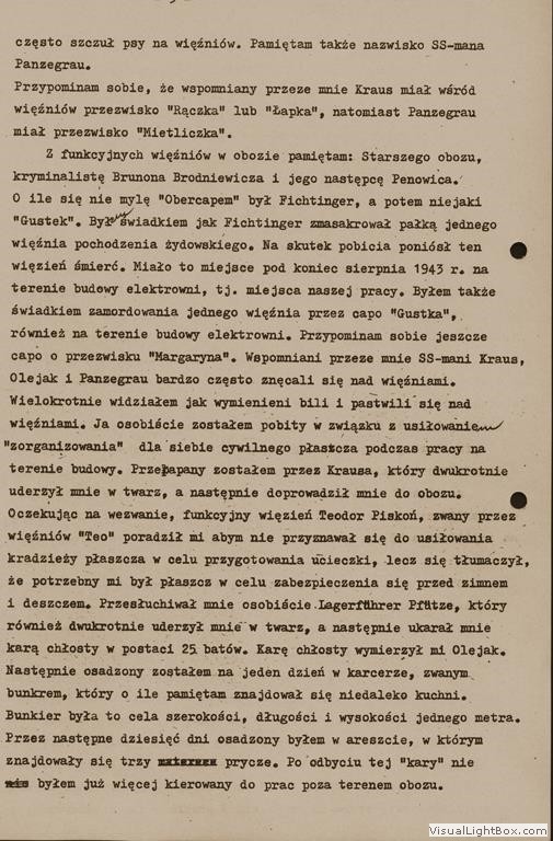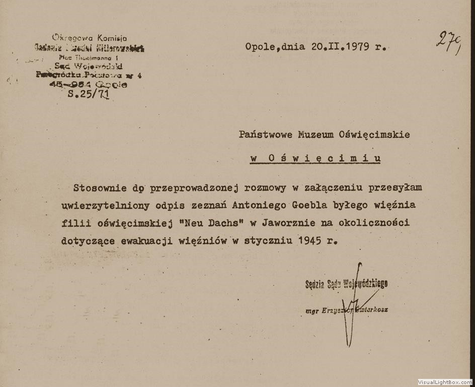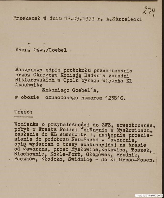 Protokół przesłuchania Antoniego Goebla, byłego więźnia podobozu Neu Dachs, [w:] Oświadczenia, t. 92, k. 281-284.
