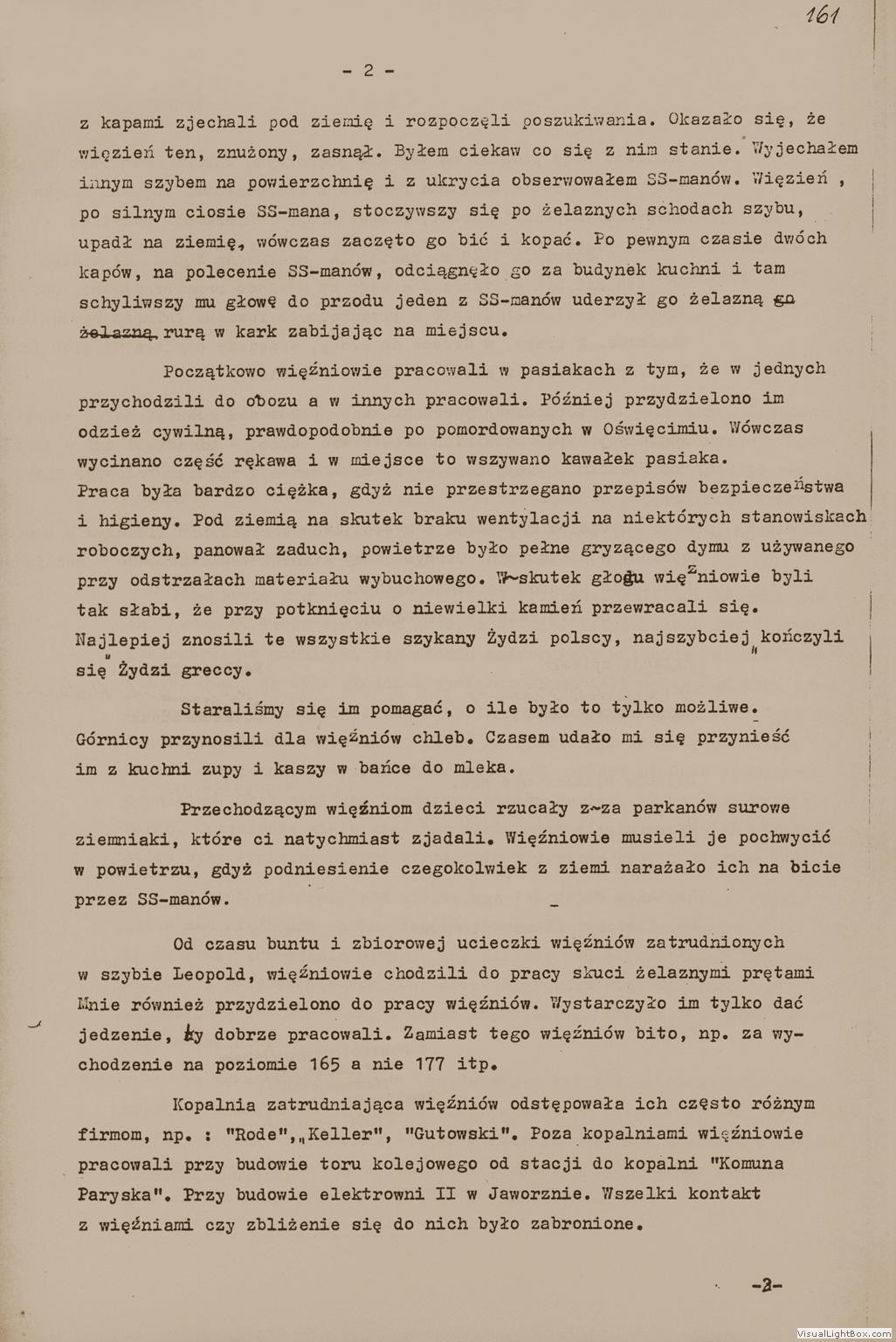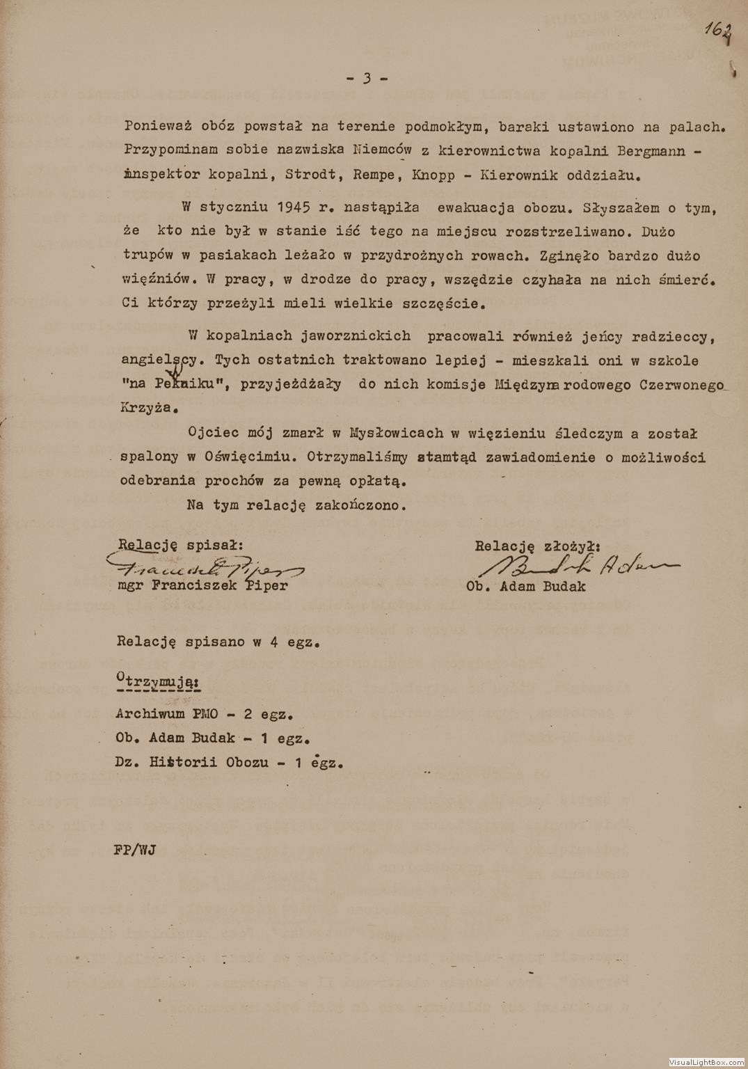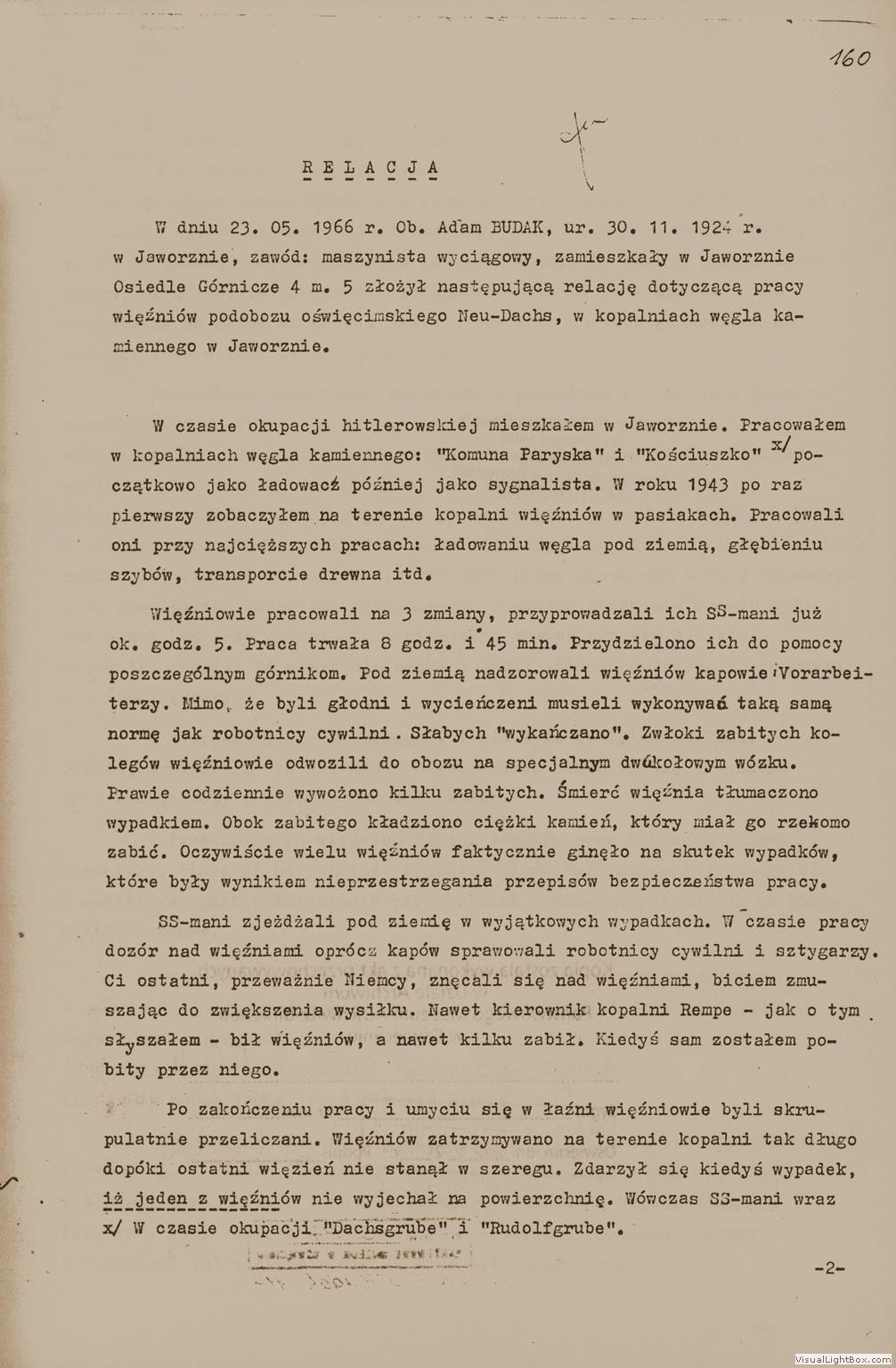 Relacja Adama Budaka, cywilnego pracownika kopalń Dachsgrube i Rudolfgrube, [w:] Oświadczenia, t. 52, k. 160-162. Ze zbiorów Archiwum Państwowego Muzeum Auschwitz - Birkenau.