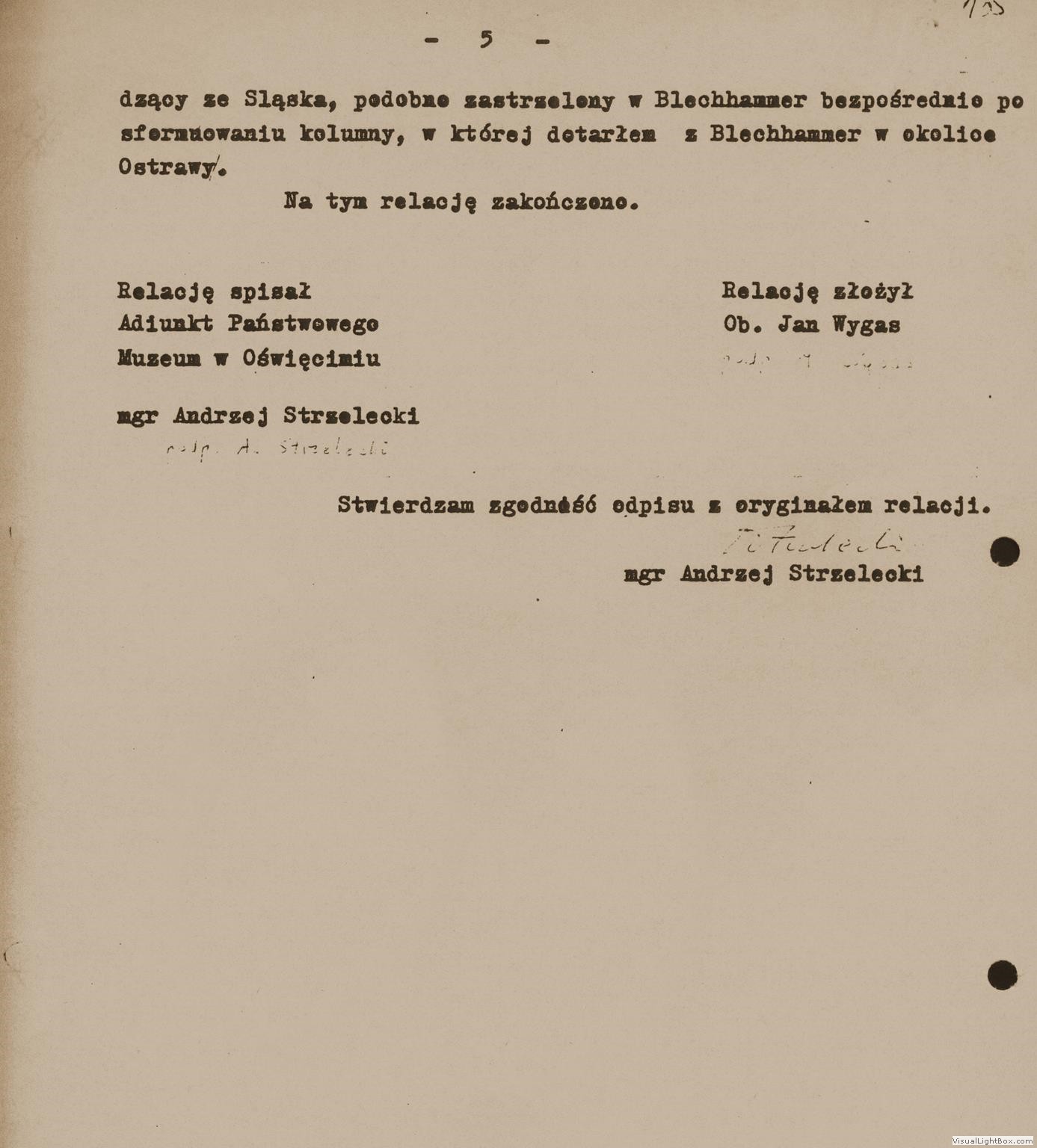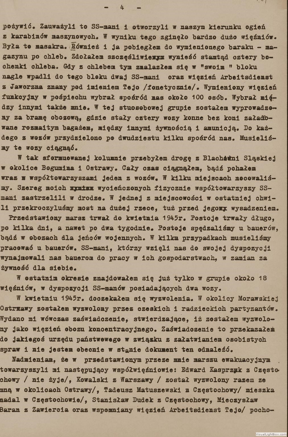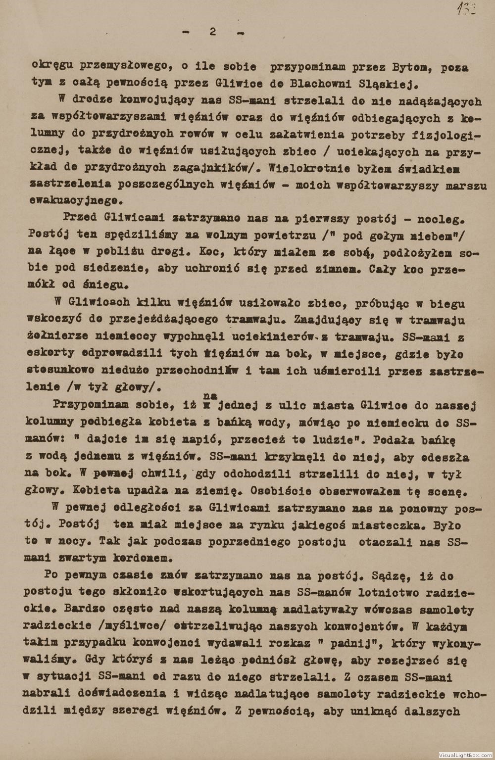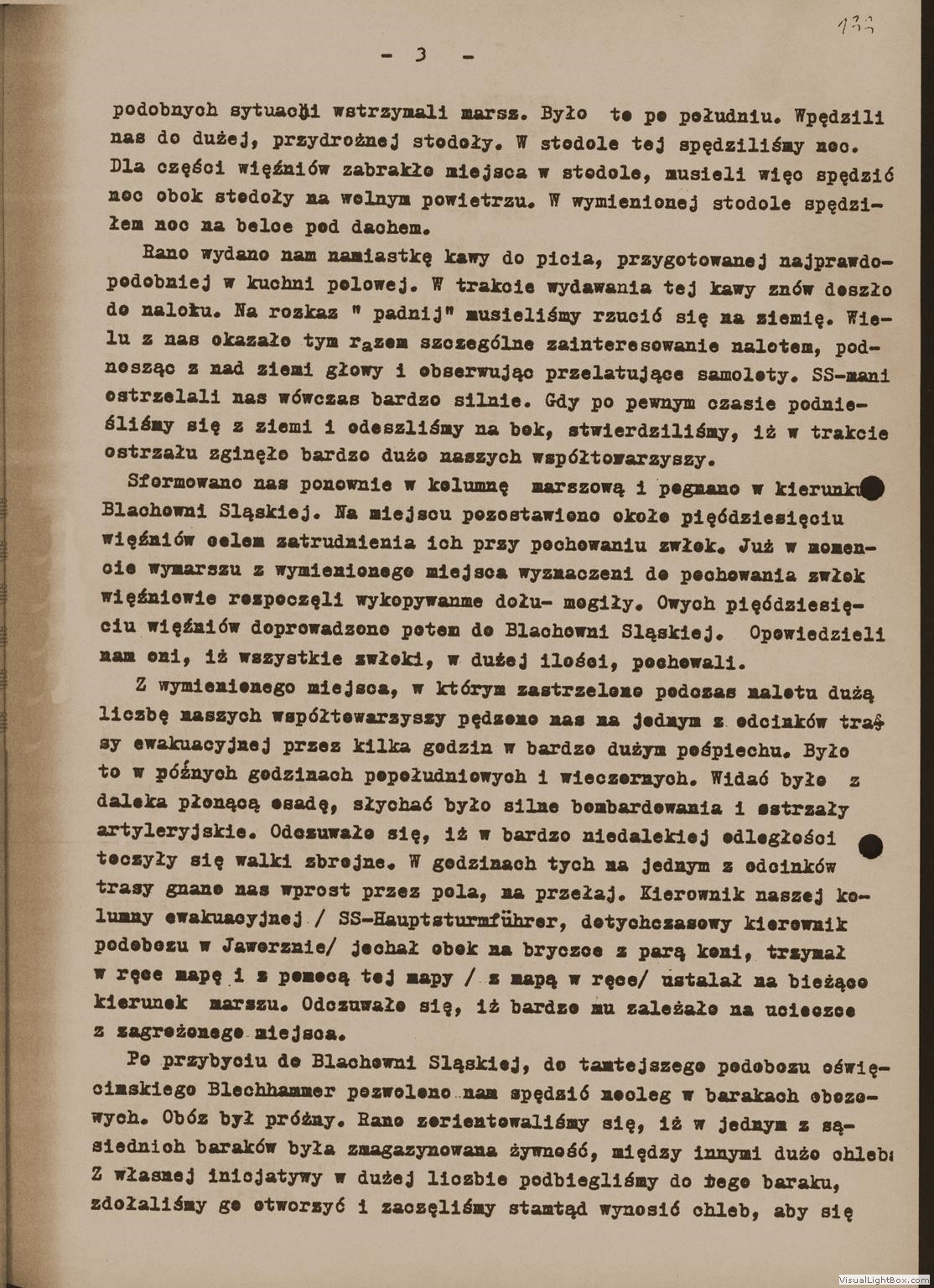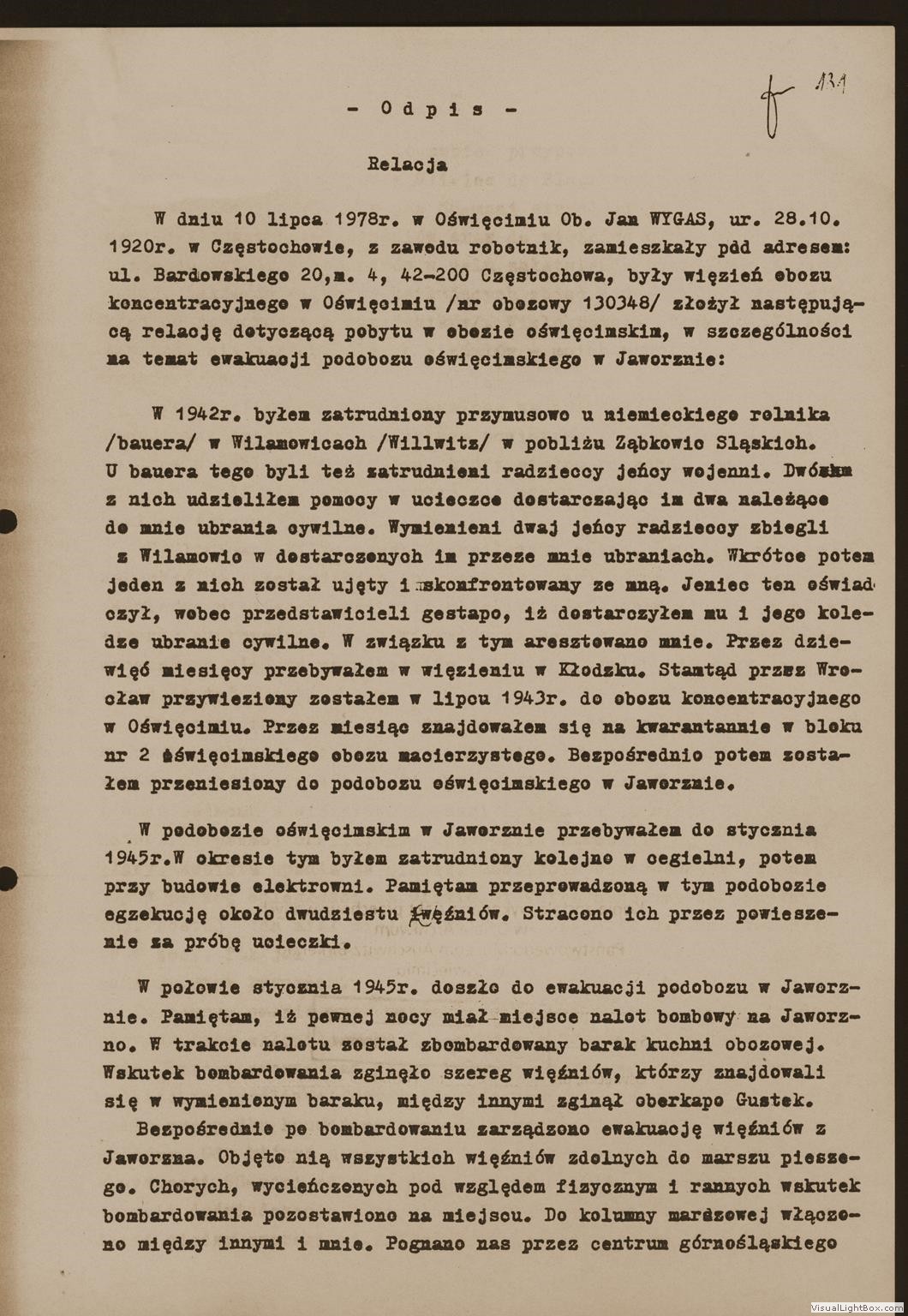 Relacja Jana Wygasa, byłego więźnia podobozu Neu Dachs, [w:] Oświadczenia, t. 89, k. 131-135. Ze zbiorów Archiwum Państwowego Muzeum Auschwitz - Birkenau.