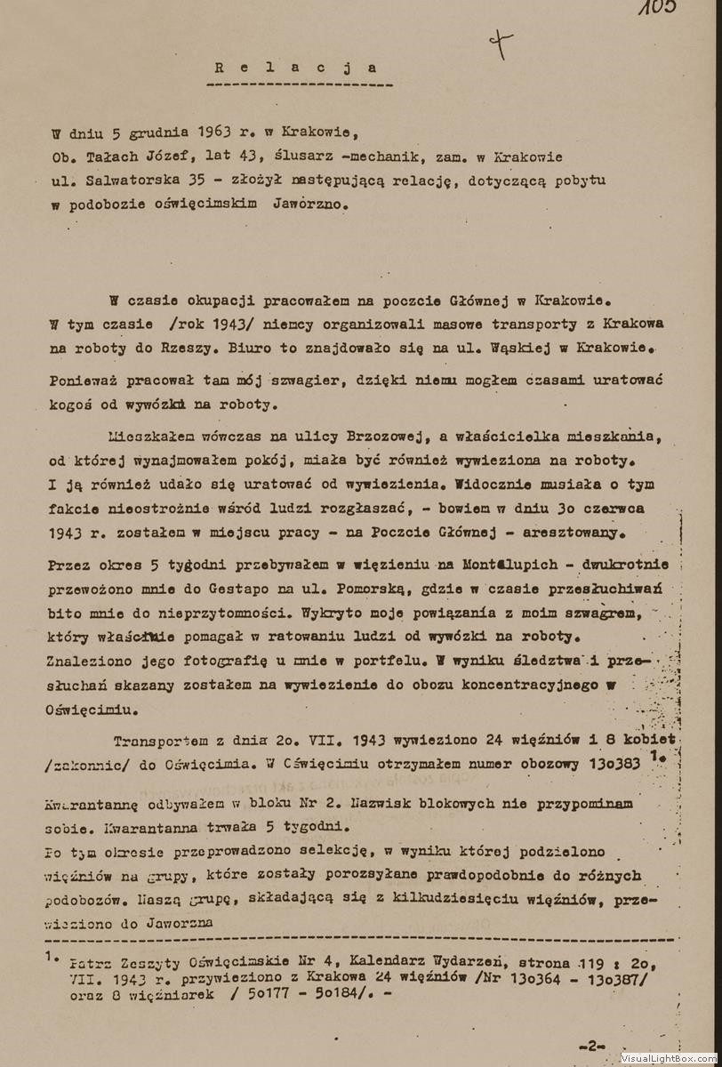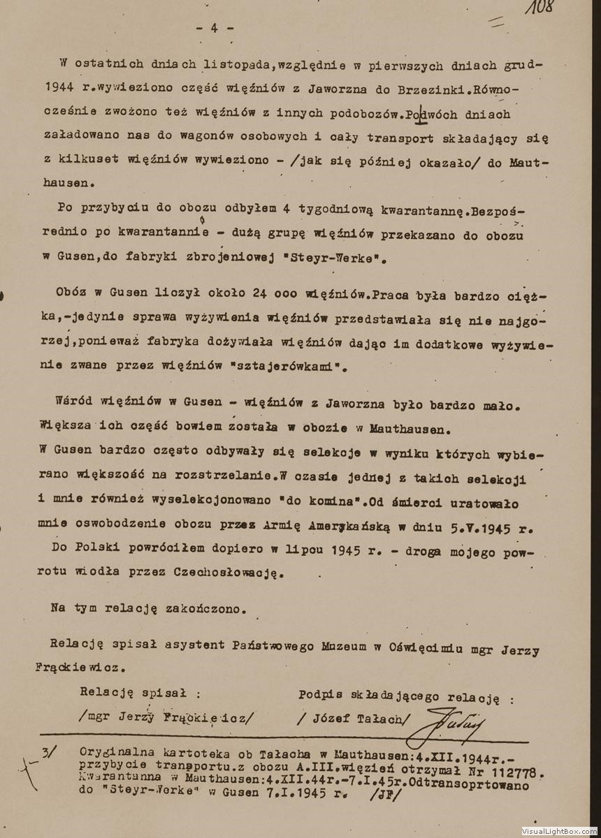 Relacja Józefa Tałacha, byłego więźnia podobozu Neu Dachs, [w:] Oświadczenia, t. 39, k. 105-108