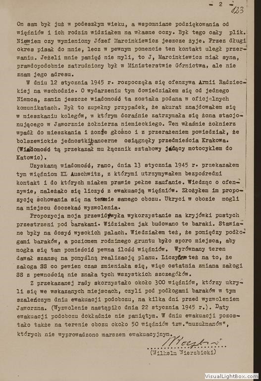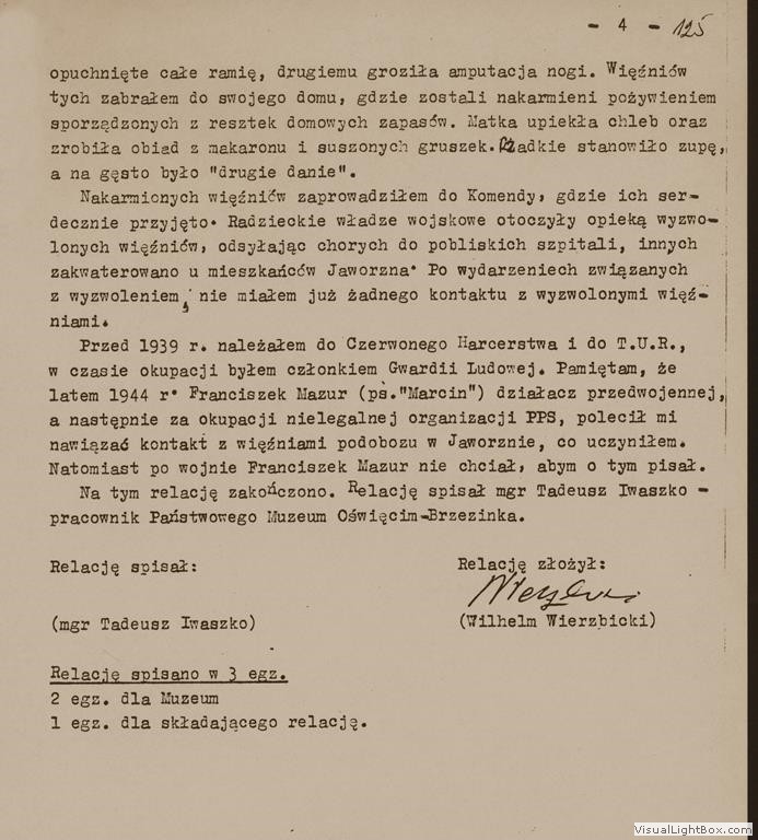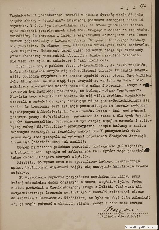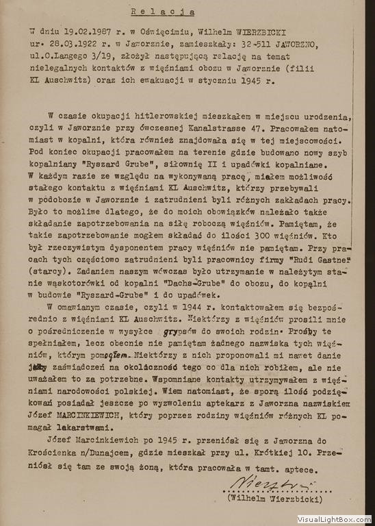 Relacja Wilhelma Wierzbickiego, cywilnego pracownika jaworznickich kopalń, [w:] Oświadczenia, t. 116, k. 122-125.